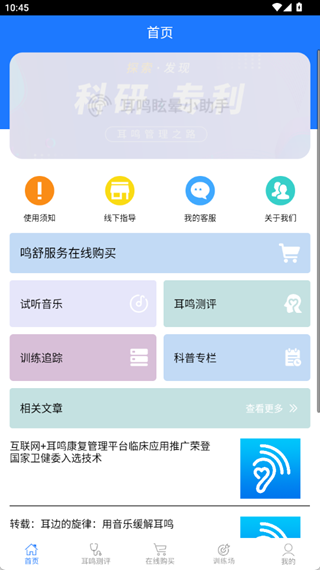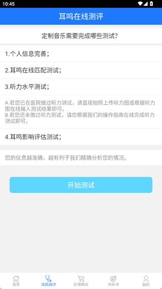 1、进入“首页”,选 “耳鸣测评”,了解测试内容,点“开始测试”,做耳鸣在线测评。