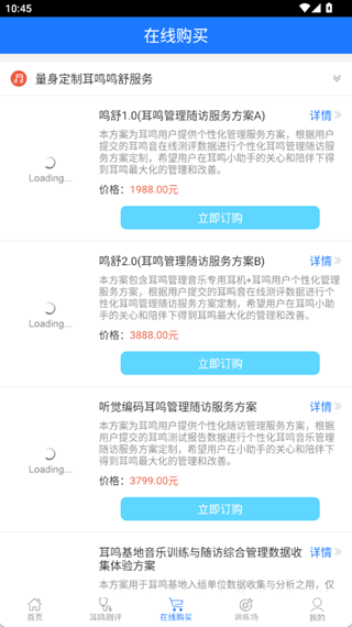 2、完成测评后,到“在线购买” 页,浏览耳鸣管理服务方案,选合适的点击立即订购。