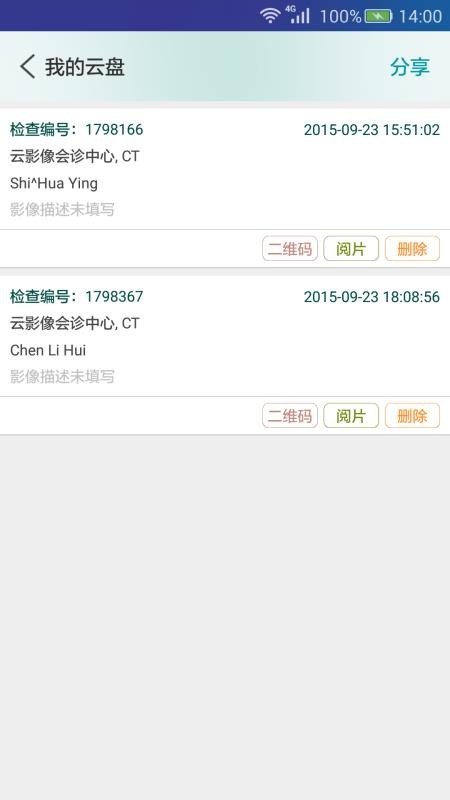 4、打开“我的云盘”,对检查编号,可生成二维码,管理影像资料。