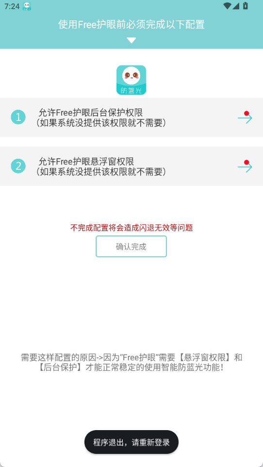 1、首次使用Free护眼,按提示完成权限配置,允许后台保护悬浮窗权限,点确认完成。