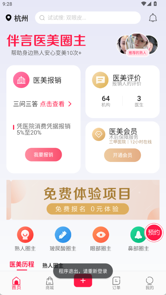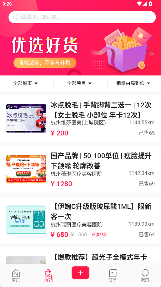 2、登录后在“首页” 浏览医美项目,或去“商城” 选优选好货。
