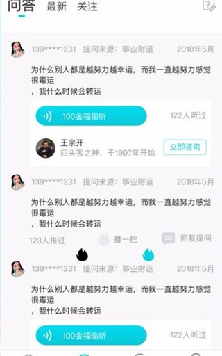 1、进入问答区,浏览他人关于事业财运等提问与回答,可播放音频、参与互动。