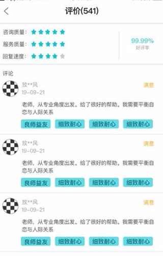 2、查看评价页,了解咨询师服务质量、回复速度等,参考评价选合适咨询师。
