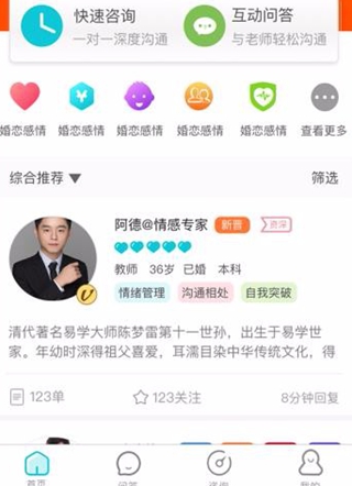 4、用快速咨询或互动问答,选情感专家,一对一深度沟通或轻松交流。