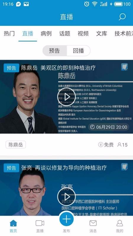 1、打开软件,进入“直播” 页,可查看预告、回播的口腔医学直播,按需选择观看学习。