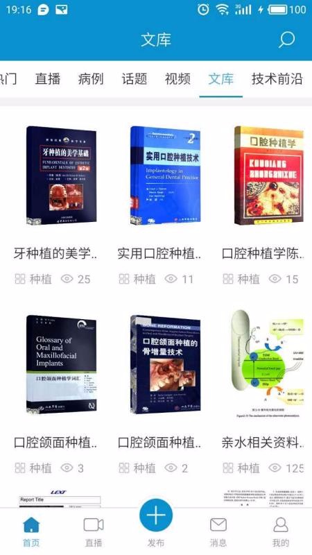 2、切换到“文库”,浏览各类口腔种植相关书籍资料,点击查看详情,获取专业知识。