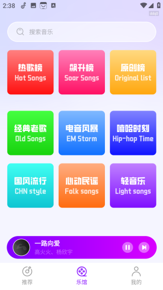 4、在乐馆页面中有热歌榜、飙升榜、原创榜、经典老歌、电音风暴、嘻哈时刻、国风流行、心动民谣以及转音乐的版块。