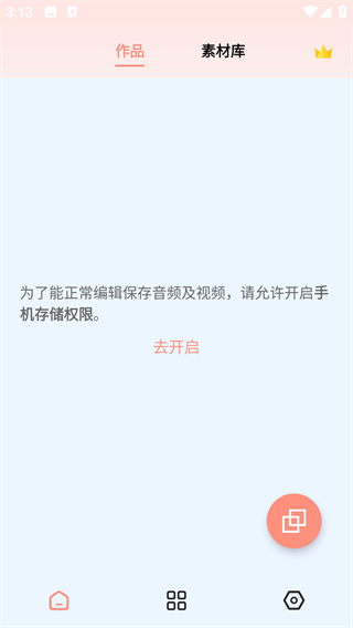 2、首次使用需要开启设备权限,开启后就可以看到自己的作品和素材库;