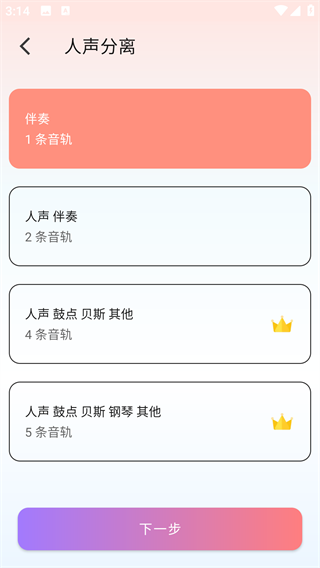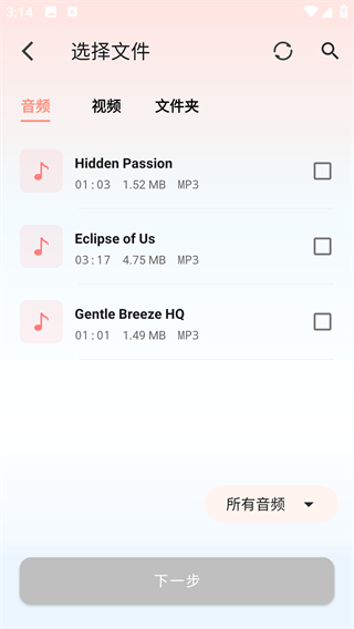 3、点击右下角可以选择音频文件,勾选需要剪辑的音频,点击下一步;