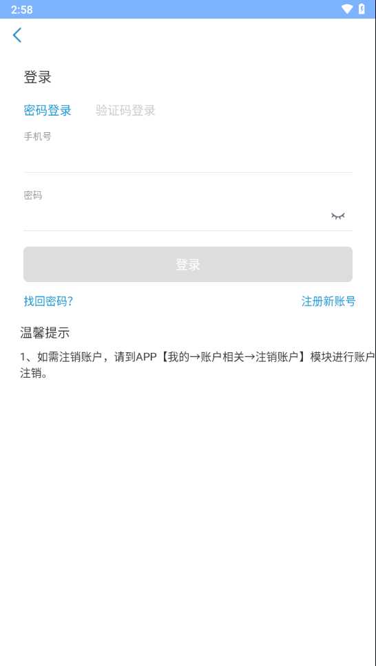 1、打开软件,选择密码或验证码登录,无账号可注册新账号后登录。