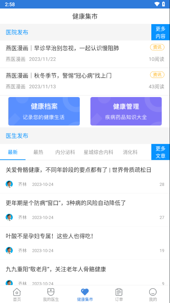 3、进入 “健康集市”,可查看医院和医生发布的健康资讯,管理健康档案。