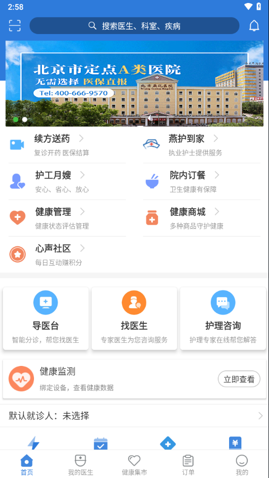 2、登录后,在首页可预约挂号,还能使用续方送药、护工月嫂等服务。