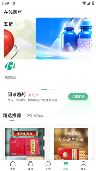 3、商城板块则是会把一些精选的药品推荐出来,如果有想购入的药可以通过立即问诊的方式联系上医生开出药来进行购买即可;