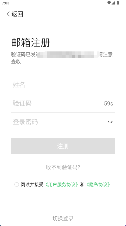 2、注册,可选择邮箱注册,填写姓名、验证码、密码,阅读并接受协议后注册。
