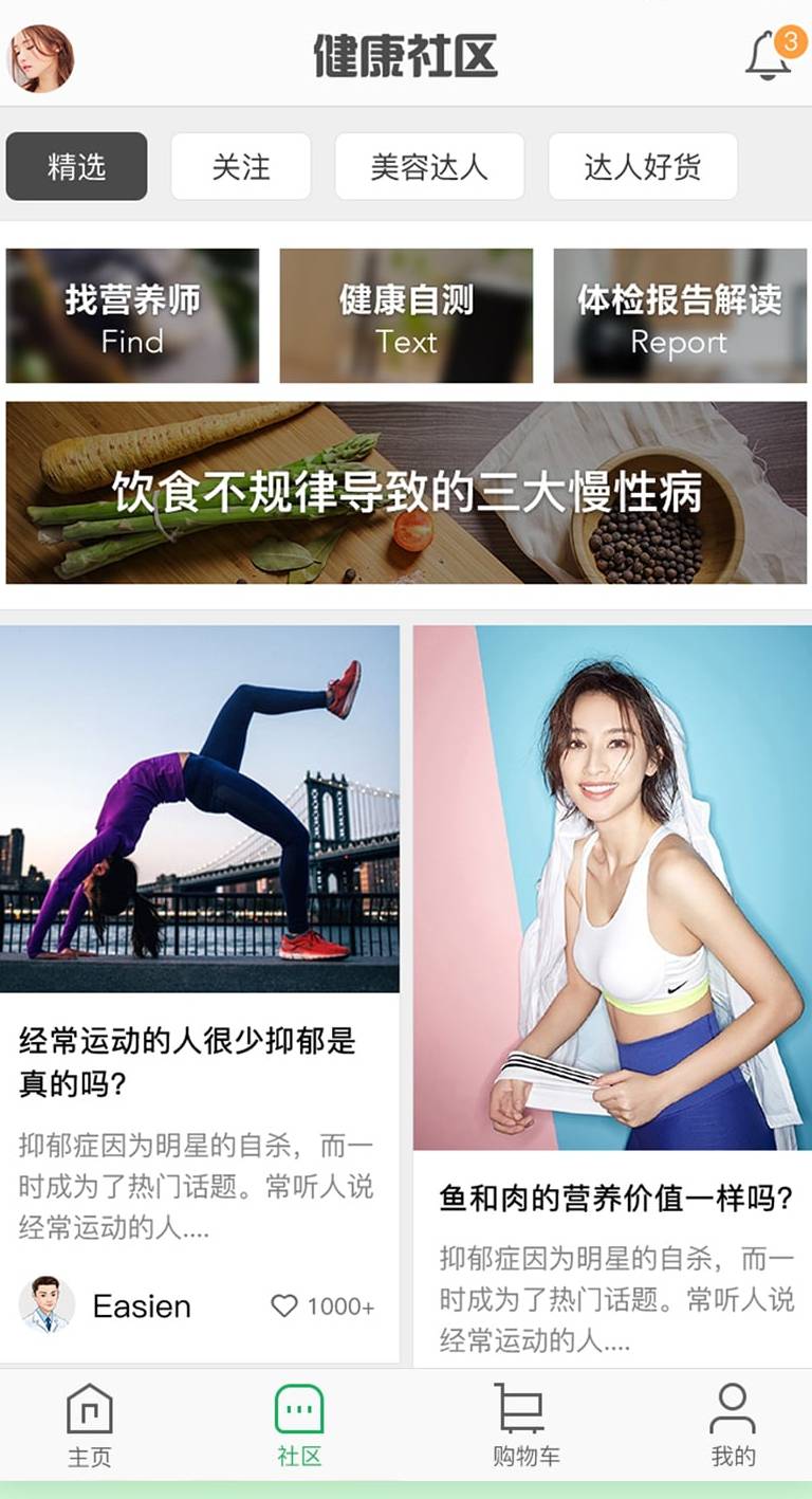 2、点击 “社区”,进入健康社区,查看精选、关注等健康相关内容。
