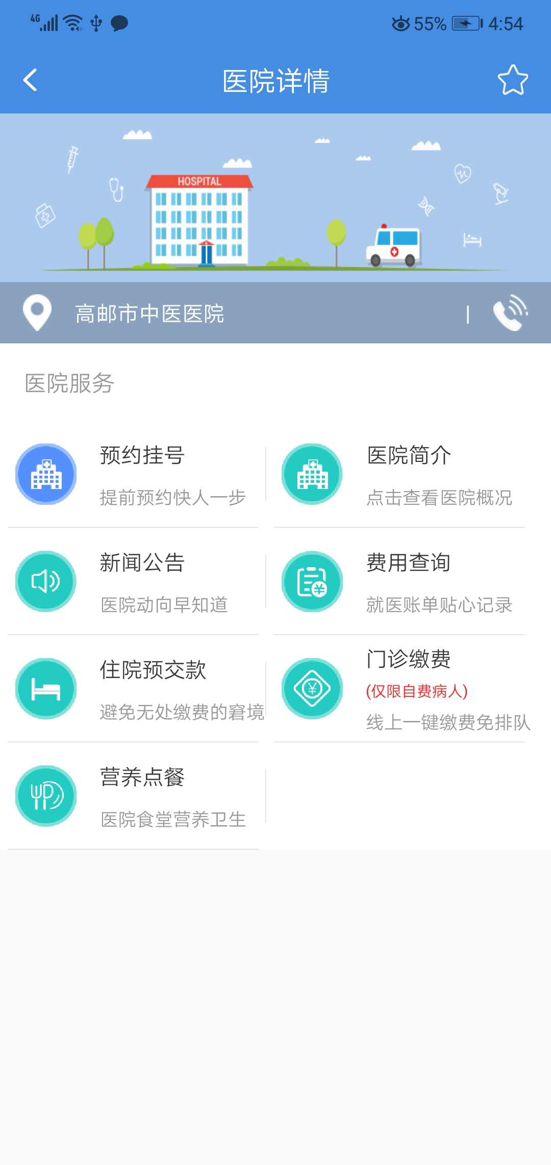 2、点击医院服务里的医院,进入医院详情页,能预约挂号、查费用等。