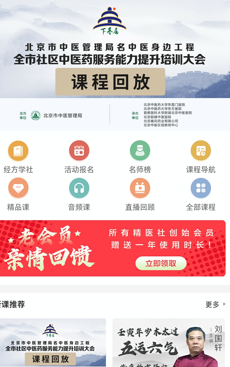 1、打开软件,首页可点击经方学社、活动报名等入口,参与课程或活动。