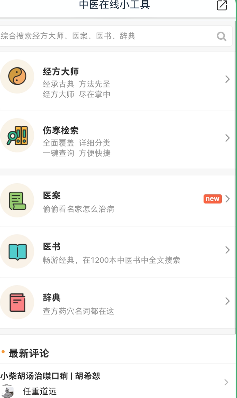 4、进入中医在线小工具,能搜索经方大师、医案、医书、辞典等内容。