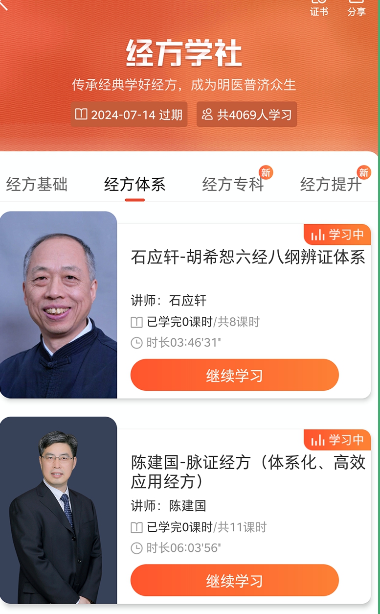 2、进入经方学社,选择经方基础、体系等分类,点击课程继续学习。