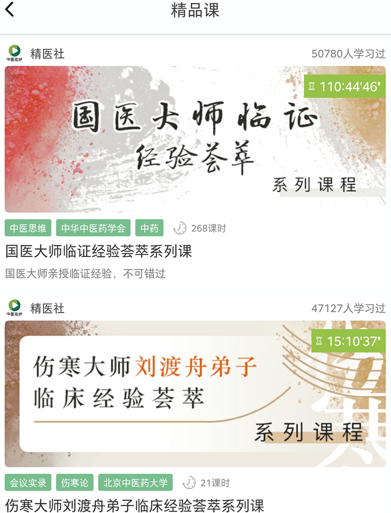 3、点击精品课,可选择国医大师临证经验等系列课程进行学习。
