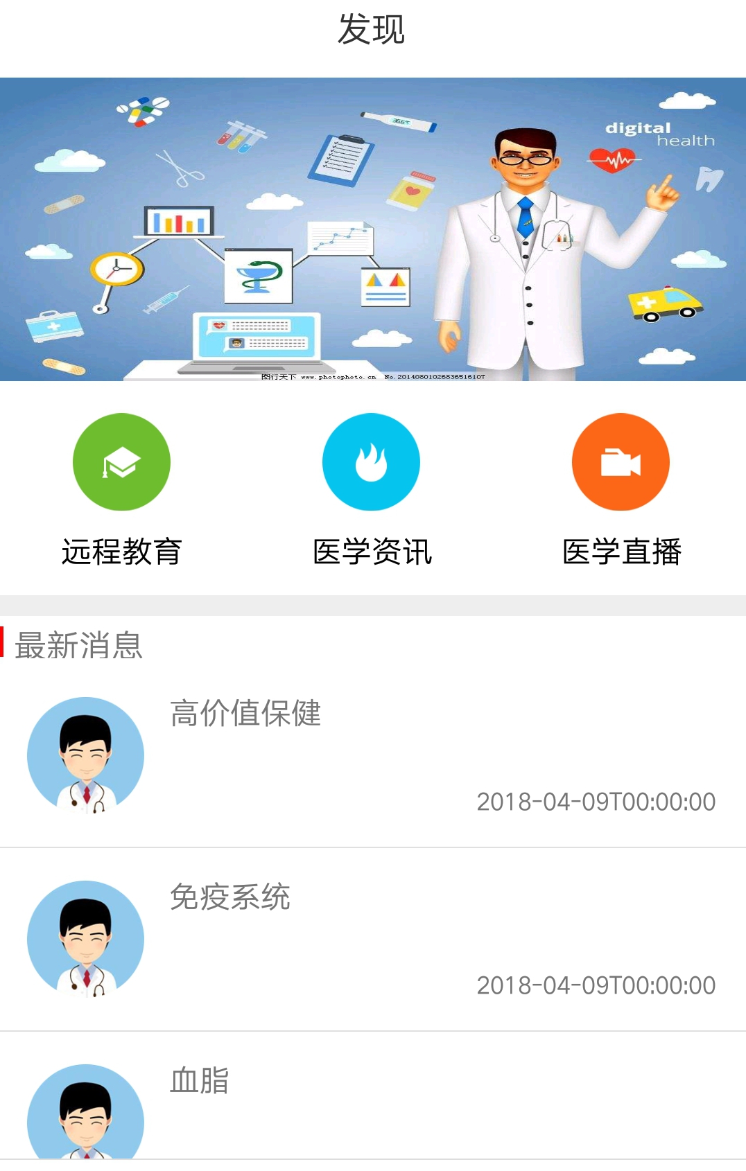 3、点击 “发现”,能参与远程教育,浏览医学资讯,观看医学直播。