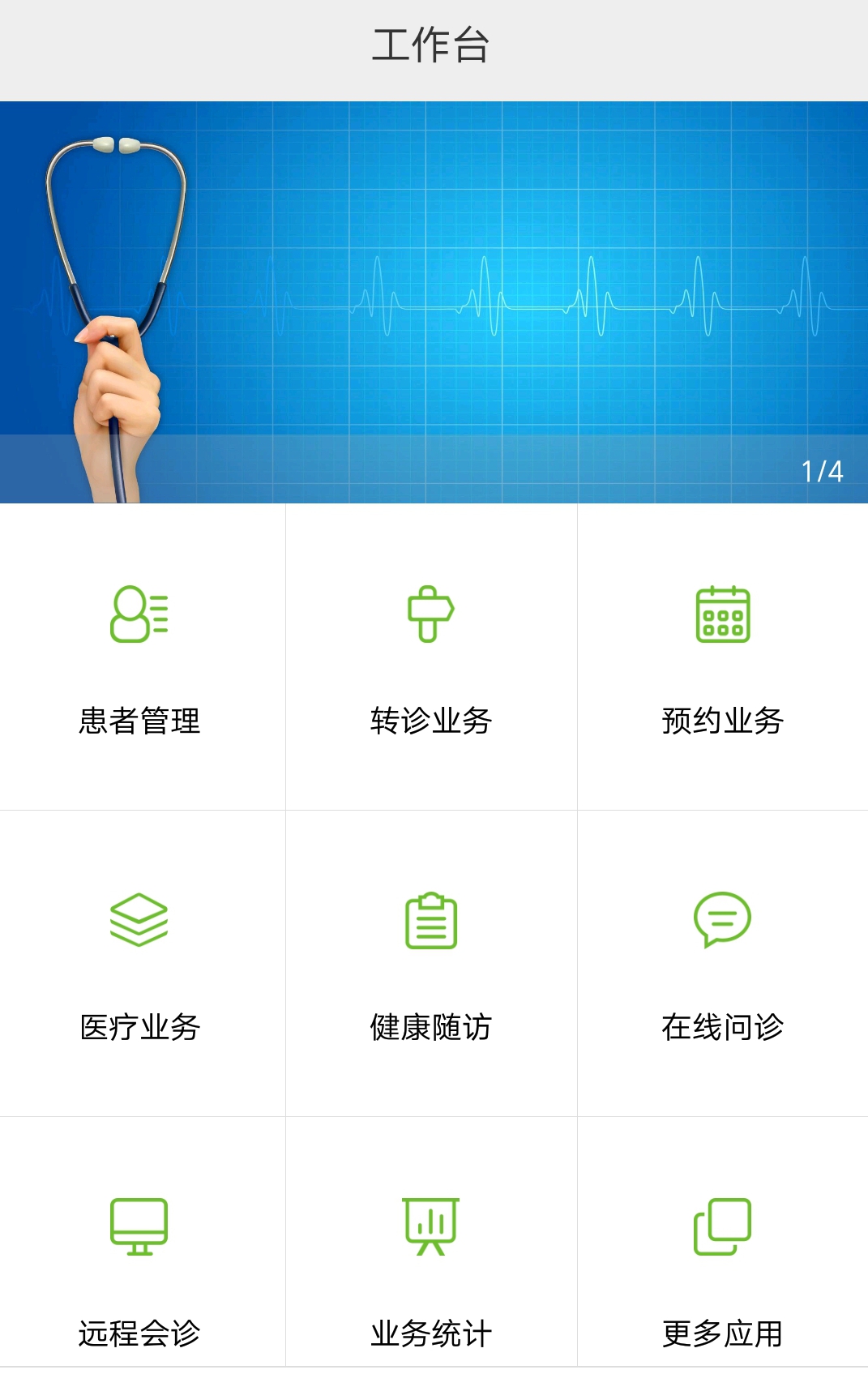 1、打开软件,进入工作台,可进行患者管理、转诊、预约等医疗业务操作。