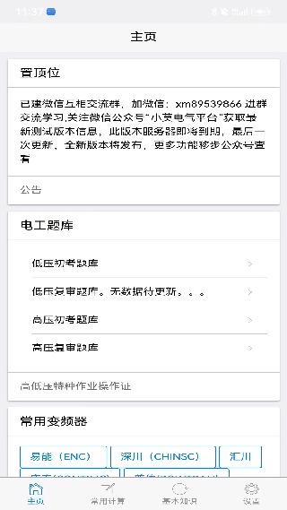 xm 电工助手是一款超棒的软件,能助力大家学习电气理论知识。它有各种常用电工计算方法,像电压、电流计算,电机转速、扭矩计算等,每个计算方法都有对应公式和概念,借此能算出各类数值。软件里电路知识丰富,能看到各种电路原理图,学到好多电学知识。它主要为电工提供便利,公式和符号随时可查,超强大!从事相关行业或对电学感兴趣的朋友,快来下载了解更多电路知识吧。