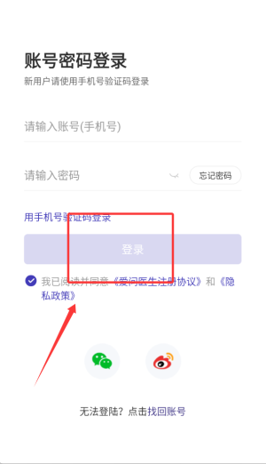 2、选择账号密码或手机号验证码登录,勾选同意协议后登录。
