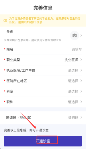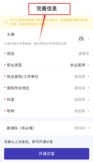 4、信息完善后,点击 “开通诊室”,即可开启相关服务。