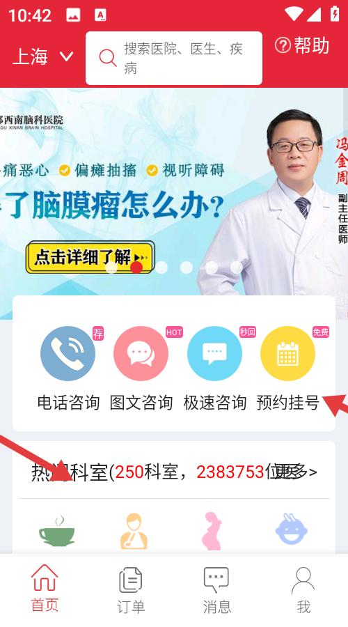 1、打开软件首页,可点击电话、图文、极速咨询,或预约挂号。