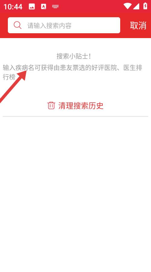 2、在首页搜索栏,输入医院、医生、疾病名,查找相关医疗信息。