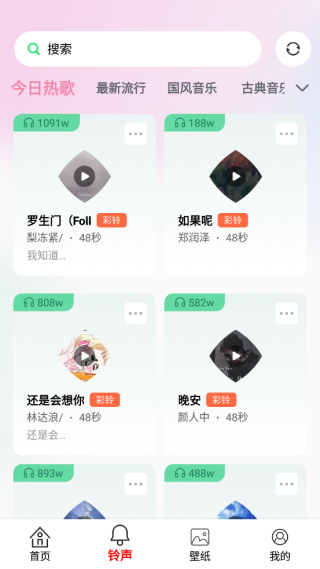 2、首页推送的铃声素材很丰富,支持多个题材的划分。