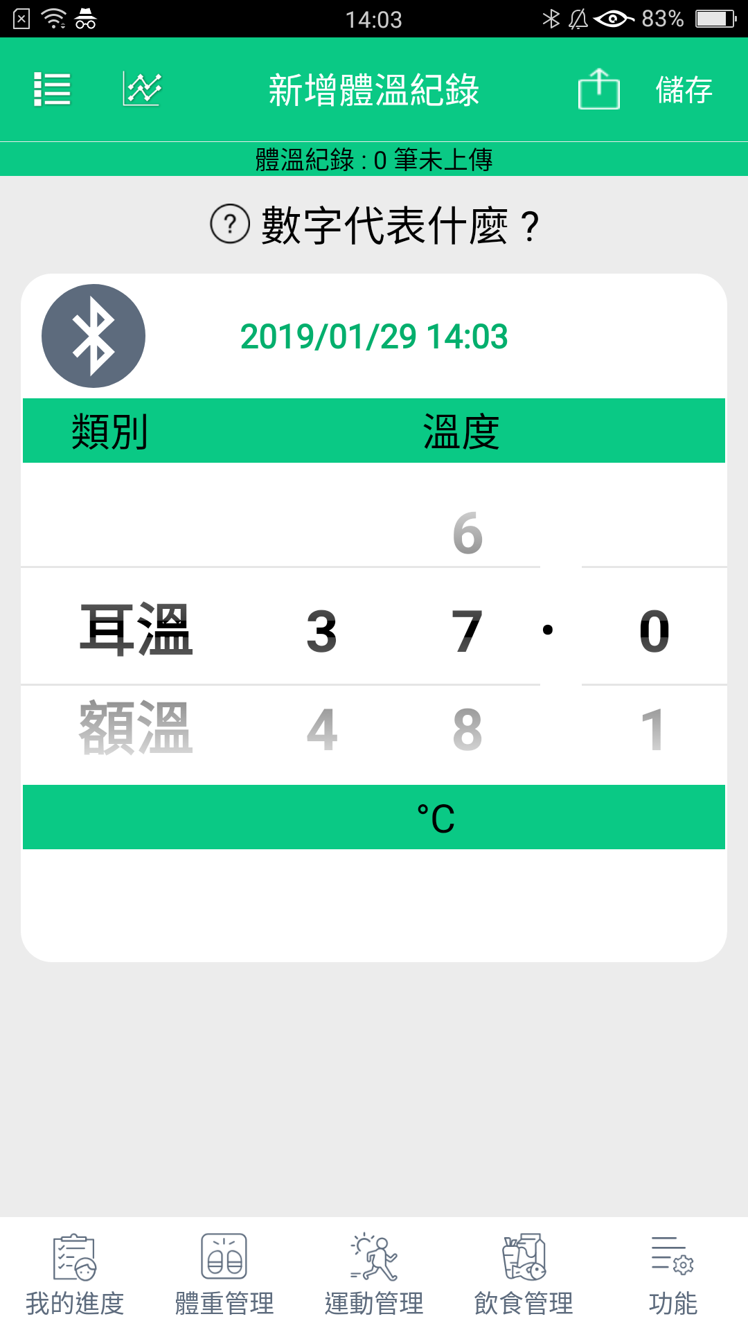 2、进入 “新增体温记录” 页面,输入耳温、额温等体温数据,点击储存。