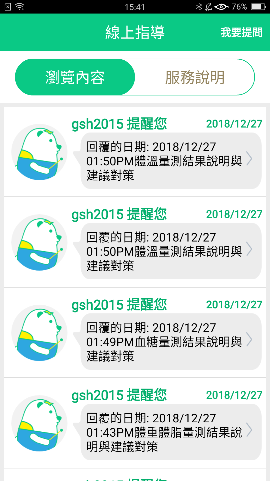 3、在 “线上指导” 页面,浏览体温、血糖等测量结果说明与建议对策。