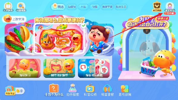 1. 打开宝宝巴士科学App,进入用户首页,点击右上角“家长中心”按钮。