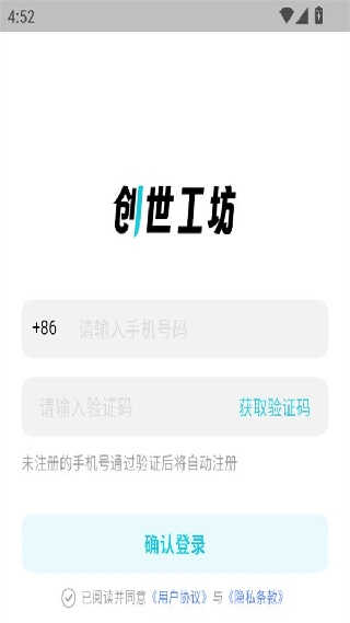 1. 首先在该网页下载并安装好创世工坊app,随后打开软件,通过手机号与验证码注册、登录账号。