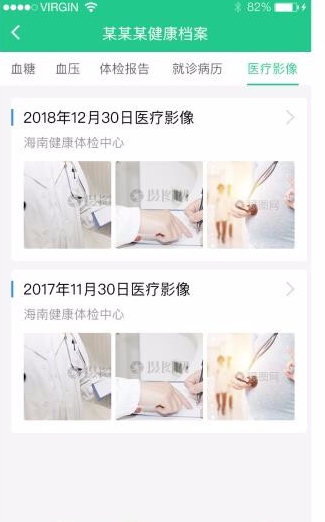 3、进入健康档案,可查看血糖、血压、体检报告、医疗影像等记录。