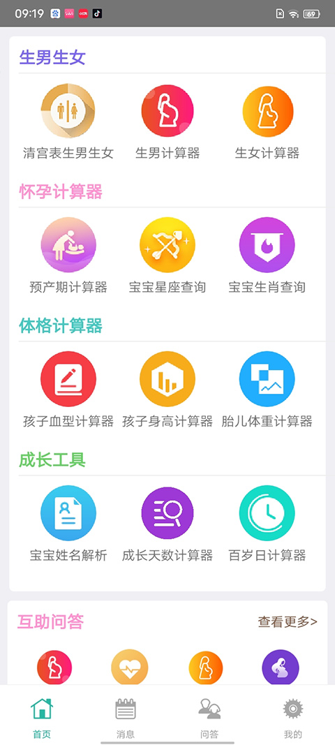 1、打开软件,在首页可使用清宫表、计算器等工具测算生男生女等。