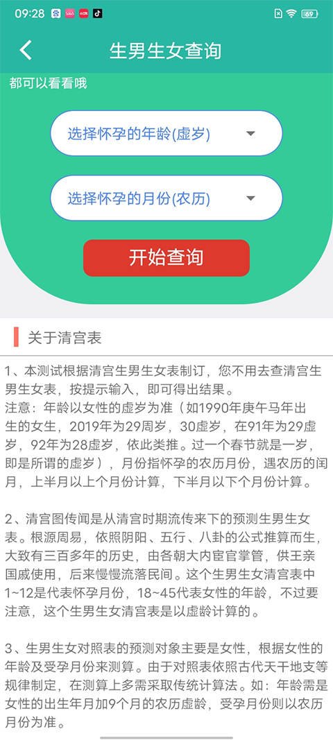 3、要查生男生女,选择怀孕虚岁和农历月份,点击 “开始查询”。