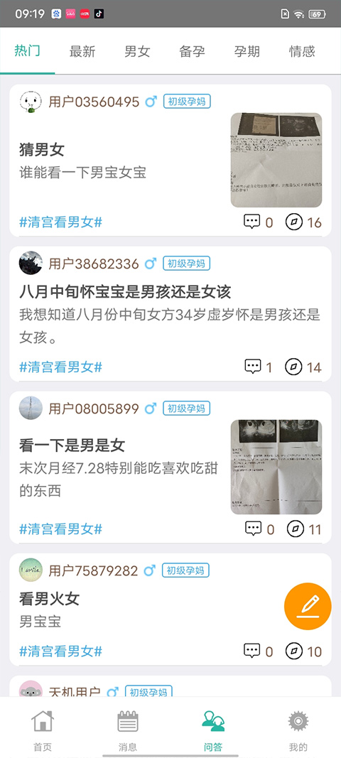 2、进入 “问答” 页面,能浏览或参与生男生女等相关话题讨论。