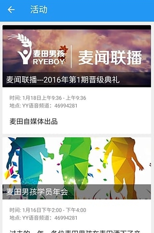 4、查看活动板块,参与麦田男孩的晋升级典礼、学员年会等活动。