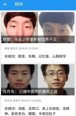 2、进入榜样板块,查看修德、月月鸟等用户的康复之路,获取激励。