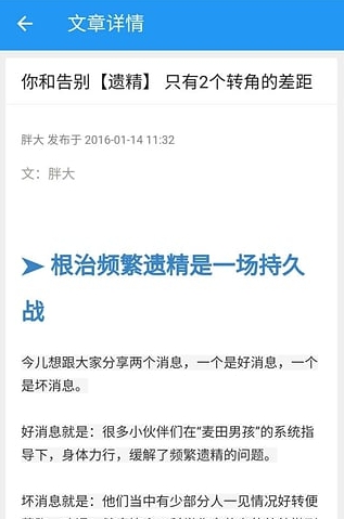 3、阅读文章详情,学习告别遗精等健康知识,了解康复方法。