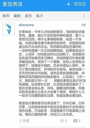 1、打开软件,可浏览推荐、最新等分类的用户分享体会,学习康复经验。