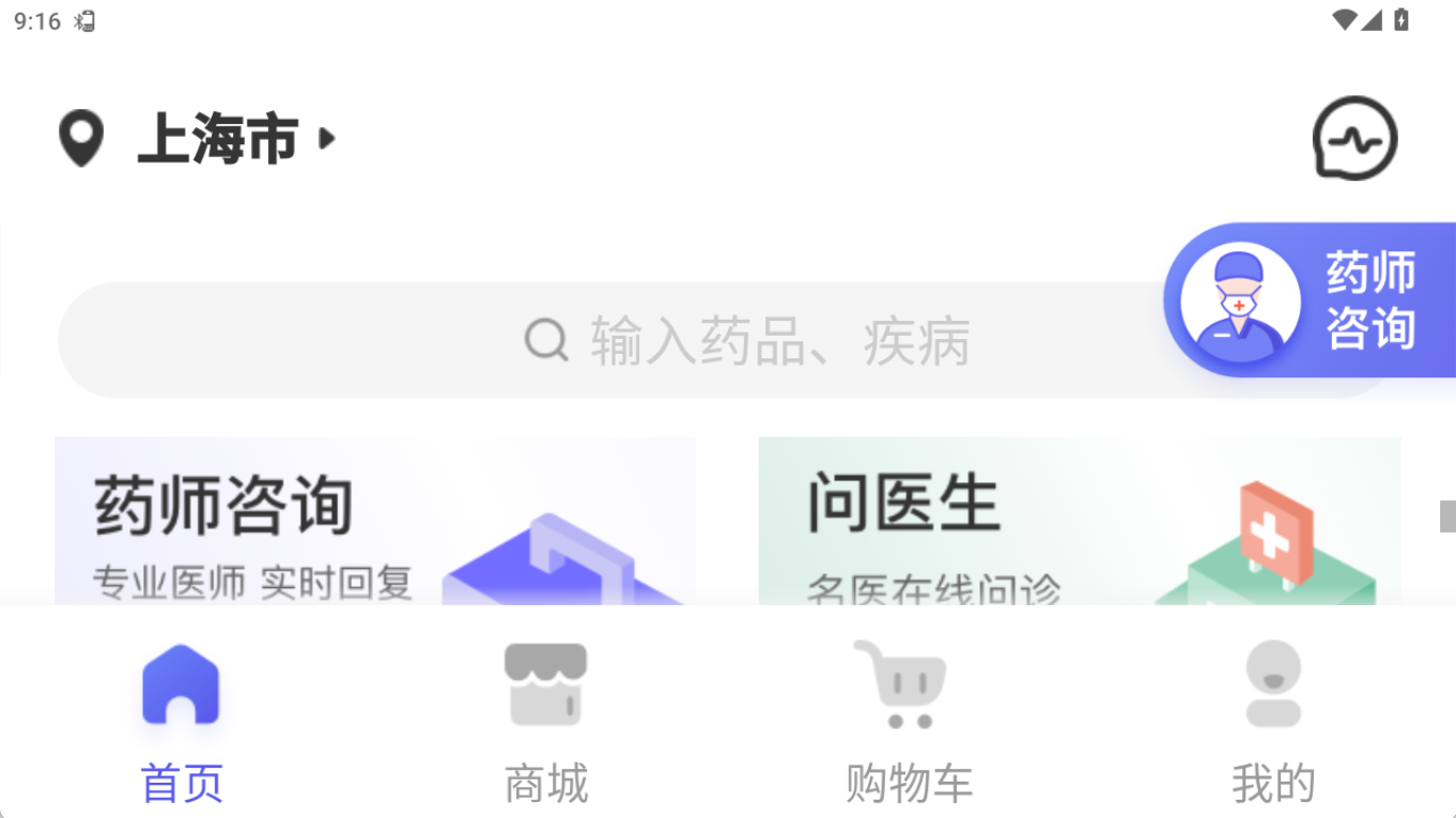 1、打开软件,进入首页,可进行药师咨询、问医生,还能搜索药品和疾病。