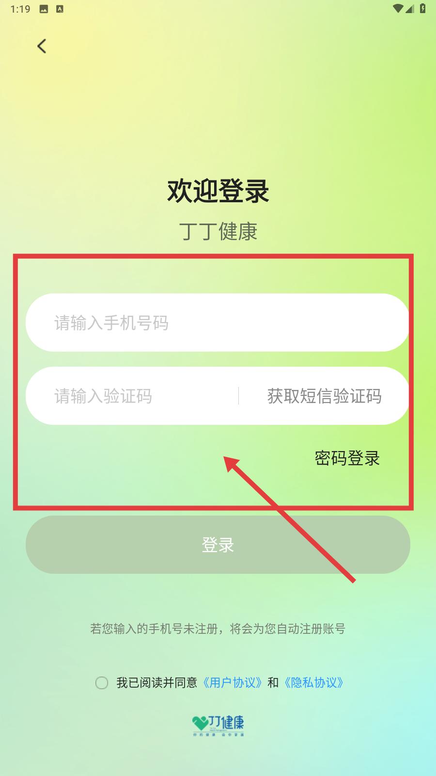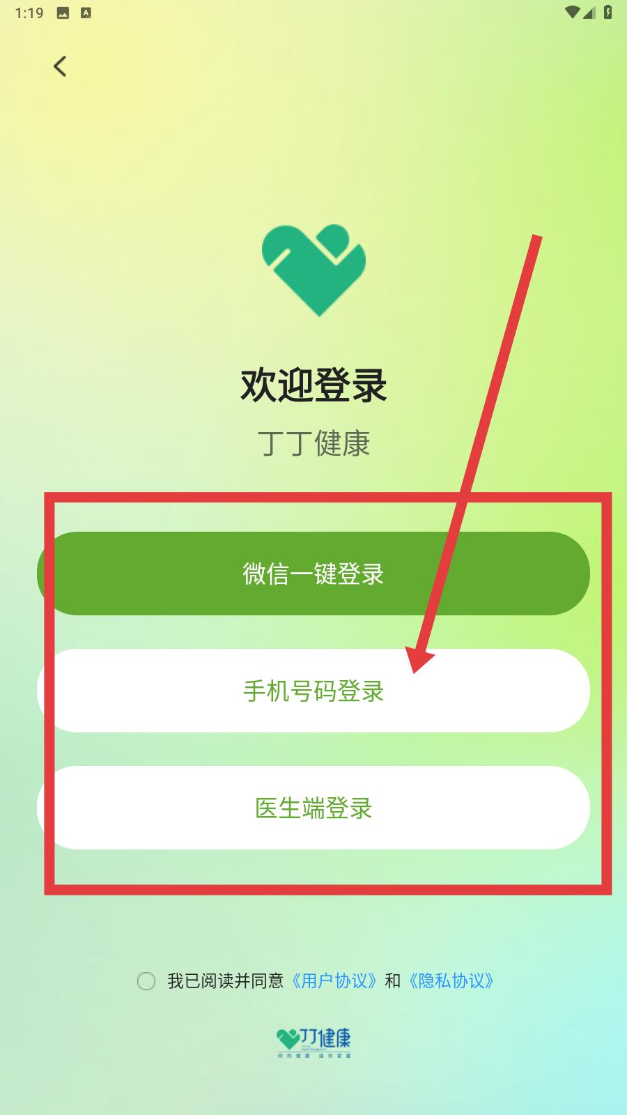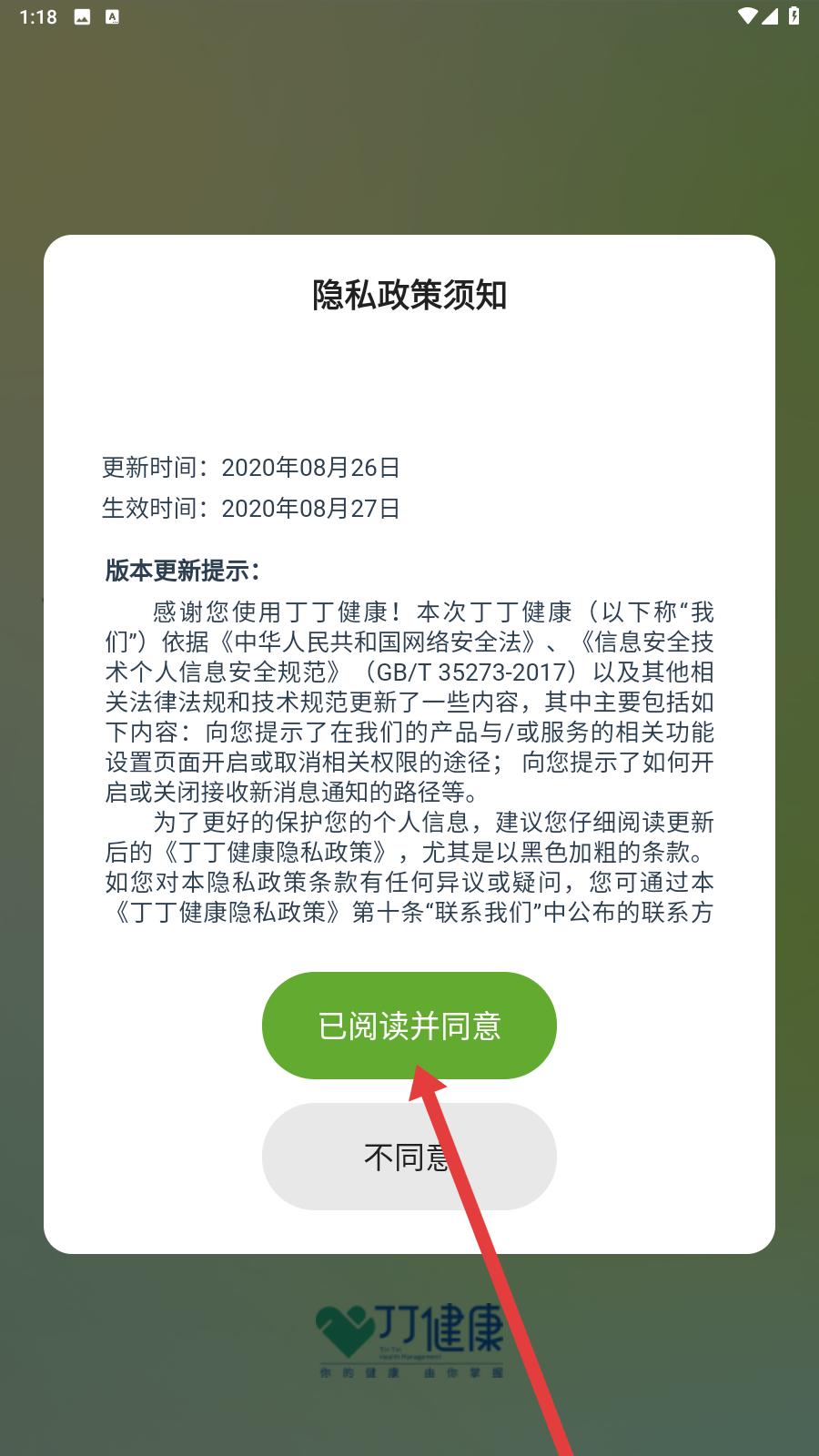 1、打开丁丁健健康APP,阅读隐私政策,点击 “已阅读并同意”。
