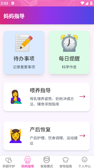 3. 点击页面下方的‘妈妈指导’,即可看到待办事项、每日提醒、喂养指导等功能;