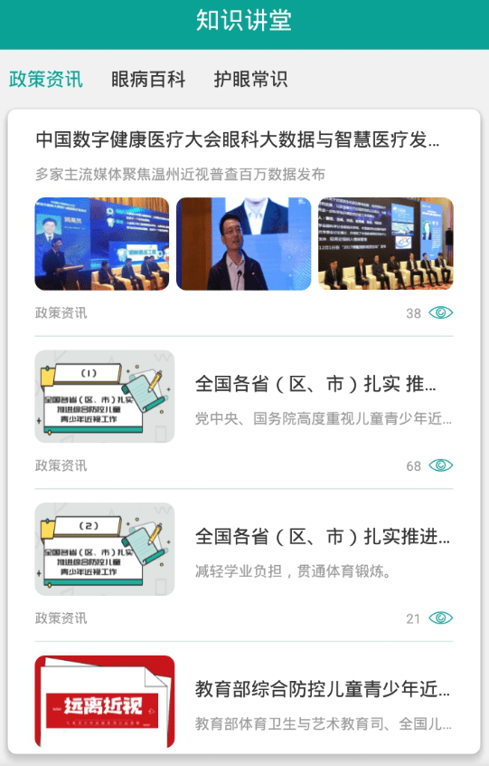 3、进入知识讲堂,查看政策资讯、眼病百科、护眼常识,学习眼健康知识。