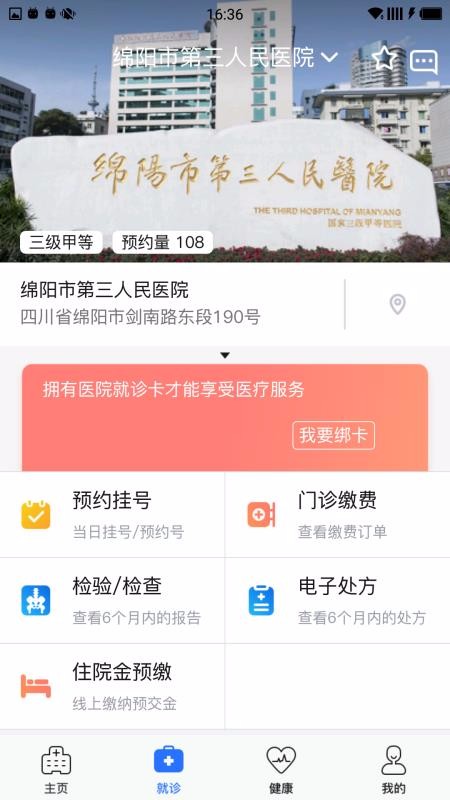 1、打开软件,进入就诊板块,绑定就诊卡,进行预约挂号、门诊缴费等操作。