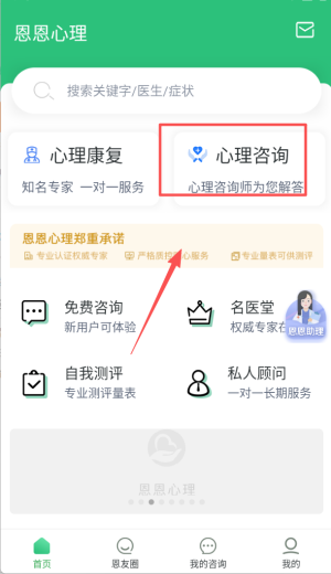 1、打开恩恩心理首页,可选择心理康复或心理咨询服务,享受知名专家一对一服务。